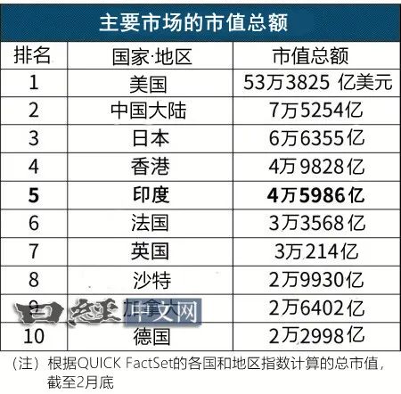 根据QUICK FactSet的各地区指数观察纳入企业的总市值(以美元为单位),印度市场正在逼近香港市场。印度的总市值在2月末达到了4.5万亿美元。总市值的规模仅次于美国、中国大陆、日本和香港,居世界第5位。