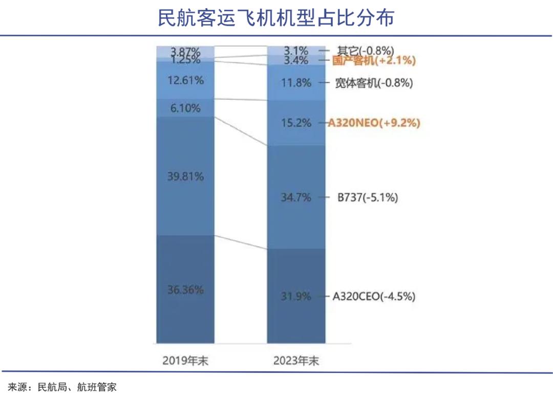 来到2023年,由于ARJ21进入快速交付期、C919开启商业运营,国产机队占比已提升至3.4%,而波音因事故丑闻,A320CEO迎来换代升级,占比呈现下降趋势,国产飞机在民航运输中的地位愈发重要。