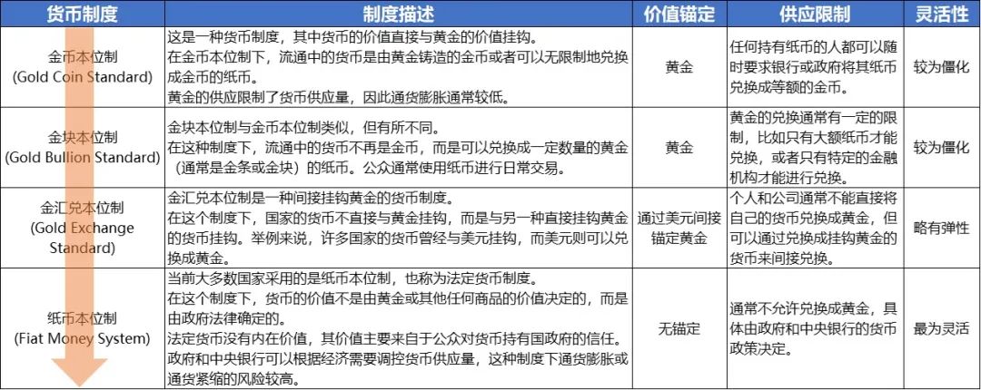 在货币史上我们曾先后经历了金币本位制、金块本位制、金汇兑本位制,以及当前的纸币本位制,即信用货币体系。而随着货币制度的迁移,黄金与货币的关系不断发生变化,特别是在“布雷顿森林体系”解体后,包括美元在内的信用货币同黄金脱钩,黄金自此隐居幕后,从货币一转成了「主权货币的信用背书」,但其「货币属性」的烙印依旧铭刻于人心。