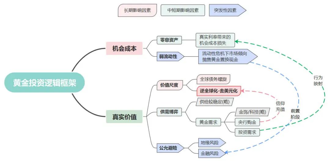 如图,笔者以为引发黄金价格波动的因素无外乎两点:黄金内在的「真实价值」,及其持有的「机会成本」。