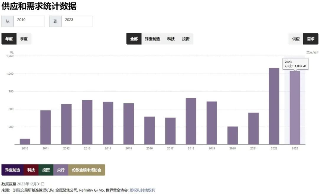 全球央行的持续购金或已指明了大方向:据世界黄金协会数据,各国央行在2022年的购金量为1136吨,是自1950年有记录以来的最高水平,2023年全球净购金量为1037吨,也是有记录以来的第二高。