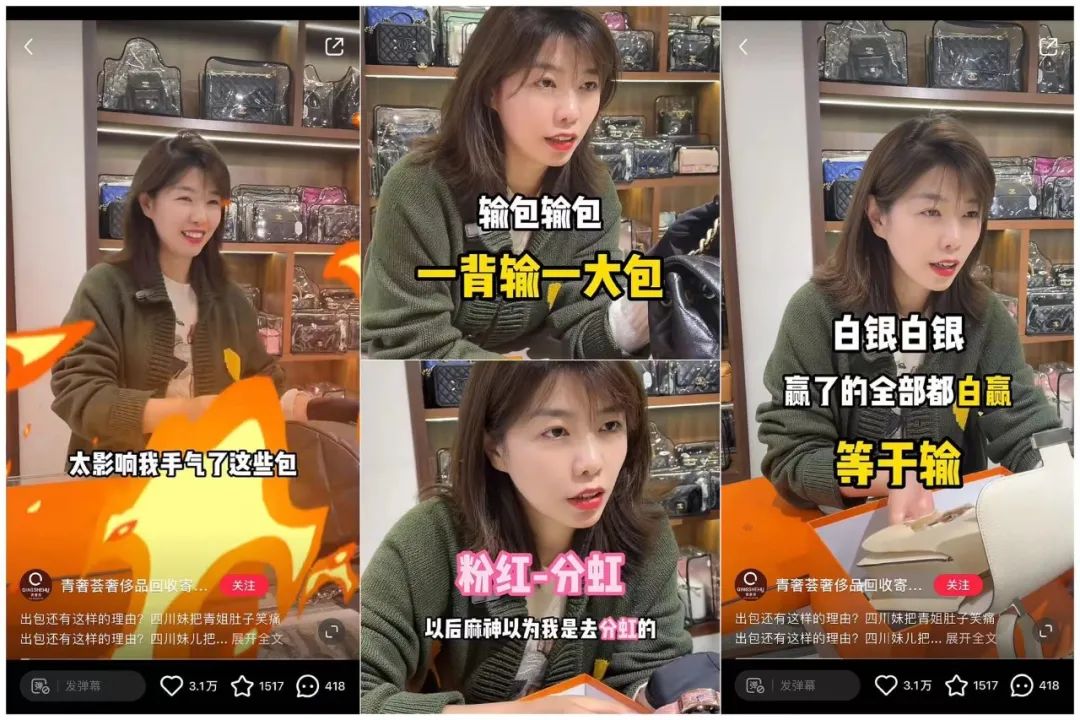 在她的视频里着实能看到很多“世界的参差”:有19岁的富二代被妈妈送了经典款大牌包觉得没特色,决定出掉换一款色彩缤纷但大众眼中的小废包;有三年前拿着房款买包,现在想出掉换房,却发现包赔的钱和房贬值的钱竟然差不多的“幸运儿”;还有想挑战不花钱换爱马仕搭配新买的大衣,最后为了凑够数却把大衣一起出掉的“随性姐”……各种颇具喜感的剧情,着实为青姐吸引了不少粉丝,目前该账号在小红书已经积累了60.2W粉丝,日常作品的数据表现也十分亮眼。
