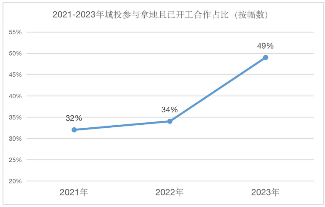 2023年最高接近50%,而城投独立拿地且未找合作方地块的开工率仅为21%。