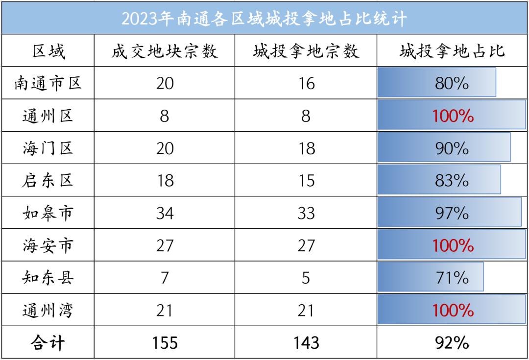 整个2023年南通成交的155宗成交地块中,有143宗为本土城投摘牌(包含5宗联合拿地)。