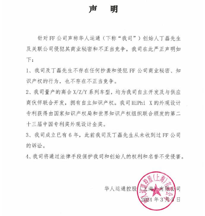 随后,高合汽车于稍晚时间在微博发表声明称,该公司及丁磊不存在任何抄袭和侵犯FF公司商业秘密、知识产权的行为,也不存在不正当竞争;该公司量产的高合X/Z/Y系列车型,均为自主开发及与供应商伙伴联合开发,拥有自主知识产权;公司成立已有6年,此前公司及丁磊从未收到过F公司的诉讼。