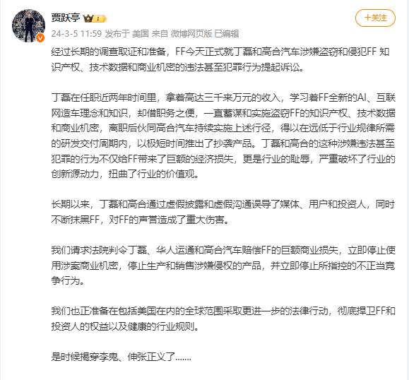 FF创始人贾跃亭还通过社交媒体发文称:“经过长期的调查取证和准备,FF今天正式就丁磊和高合汽车涉嫌盗窃和侵犯FF知识产权、技术数据和商业机密的违法甚至犯罪行为提起诉讼。”