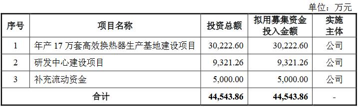 根据招股书信息,英特科技IPO拟募集资金44543.86万元。其中,年产17万套高效换热器生产基地建设项目拟募集约3.02亿元;研发中心建设项目拟募集9321.26万元,补充流动资金拟募集5000万元。