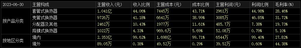 从营收构成来看,截至2023年6月底,英特科技的套管式换热器产品实现营收1亿元,营收占比为44.06%;壳管式换热器产品实现9725.86万元,占比为41.18%,分配器及其他实现营收2462.33万元,占比为10.43%;降膜式换热器产品实现营收1021.65万元,占比为4.33%。