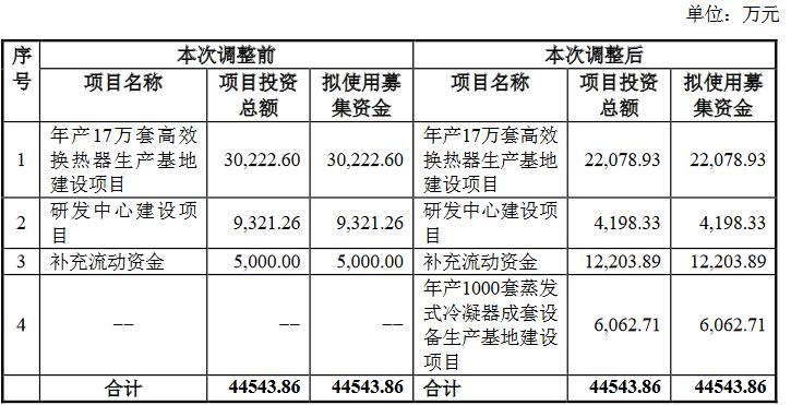 据其披露,经过调整,年产17万套高效换热器生产基地建设项目的总投资金额降低至2.21亿元,研发中心建设项目的总投资金额降低至4198.33万元。