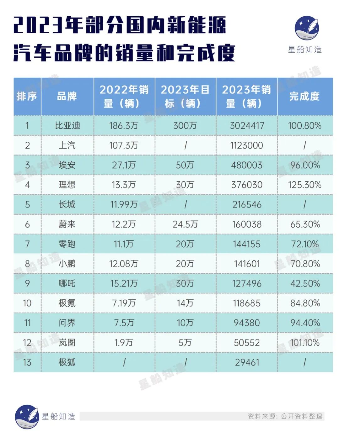 车企的价格战相关信息已经很多了,我们就不再重复写了。梳理了过去一年部分国内新能源汽车品牌的销量和完成度情况,下图: