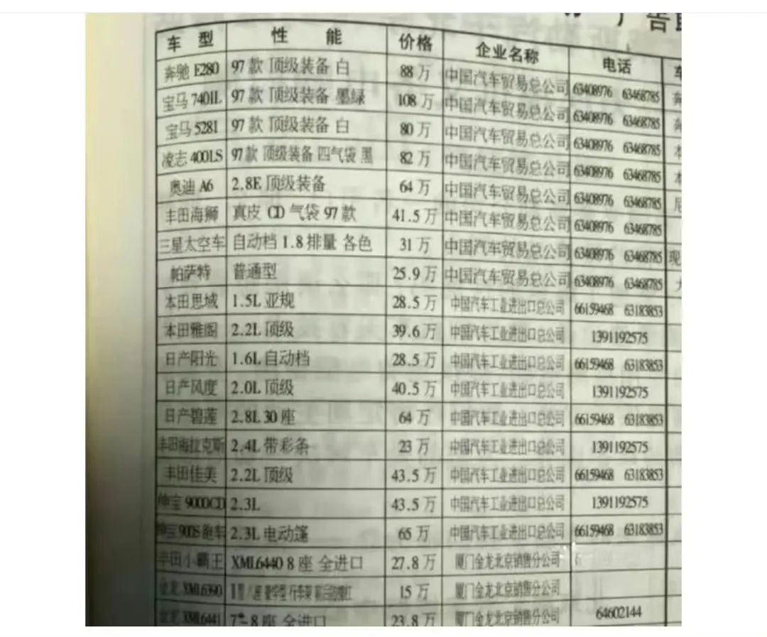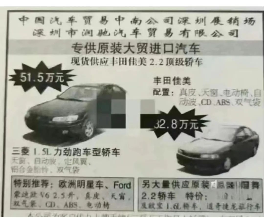 下图是网上两张二十多年前的汽车价目广告。三菱1.5L轿车售价超过50万。2.2L本田雅阁售价接近40万。1996年我国城镇职工的平均月薪是五百多元。