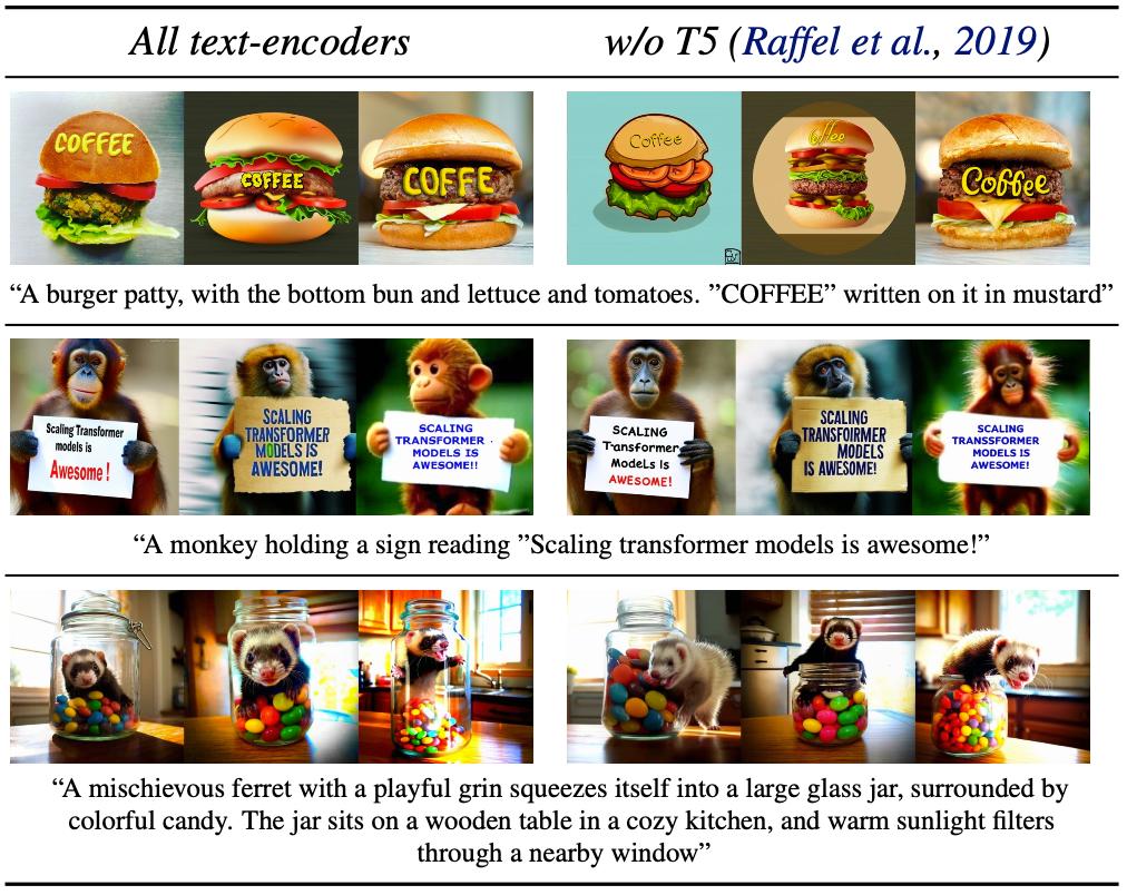 图|T5 对于复杂提示非常重要,例如,涉及高度细节或较长的拼写文本(第 2 行和第 3 行)。然而,对于大多数提示,在推理时删除 T5 仍然可以达到具有竞争力的性能。