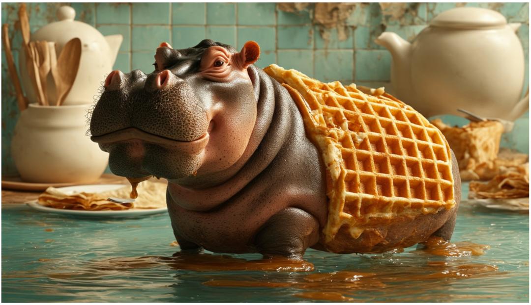 图|这是一幅异想天开、富有创意的图像,描绘了一种混合了华夫饼和河马的生物。这种富有想象力的生物有着河马独特的、笨重的身体,但它的外观却像一块金棕色的脆皮华夫饼。该生物的皮肤上有华夫饼,还有糖浆般的光泽。这设置在一个超现实的环境中,有趣地结合了河马的自然水域栖息地和早餐餐桌,包括超大的餐具或盘子作为背景。图像唤起一种有趣的荒诞感和烹饪幻想。
