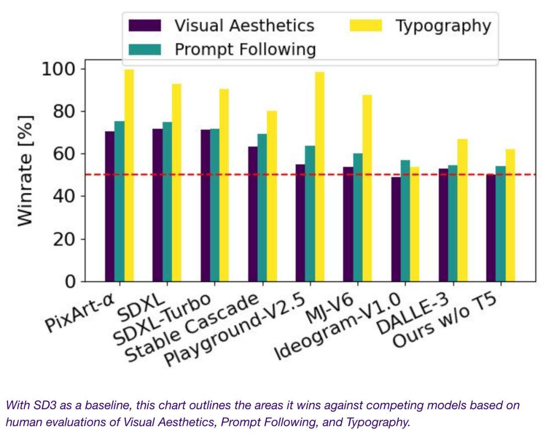 通过与其他文本到图像生成模型进行性能比较,Stable Diffusion 3 展现出了明显的优势。在视觉美感、文本遵循和排版等方面,Stable Diffusion 3 都能够超越包括 DALL·E 3、Midjourney v6 和 Ideogram v1 在内的最先进系统。