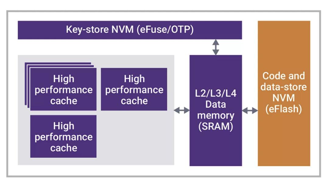 代码和数据存储存储器:高容量NVM存储启动代码、固件和数据。随着 AI/ML、IoT 和自动化的进步,存储器容量也在不断增加,而功耗也变得至关重要。以前,嵌入式闪存(eFlash)是实现这一目的的选择。