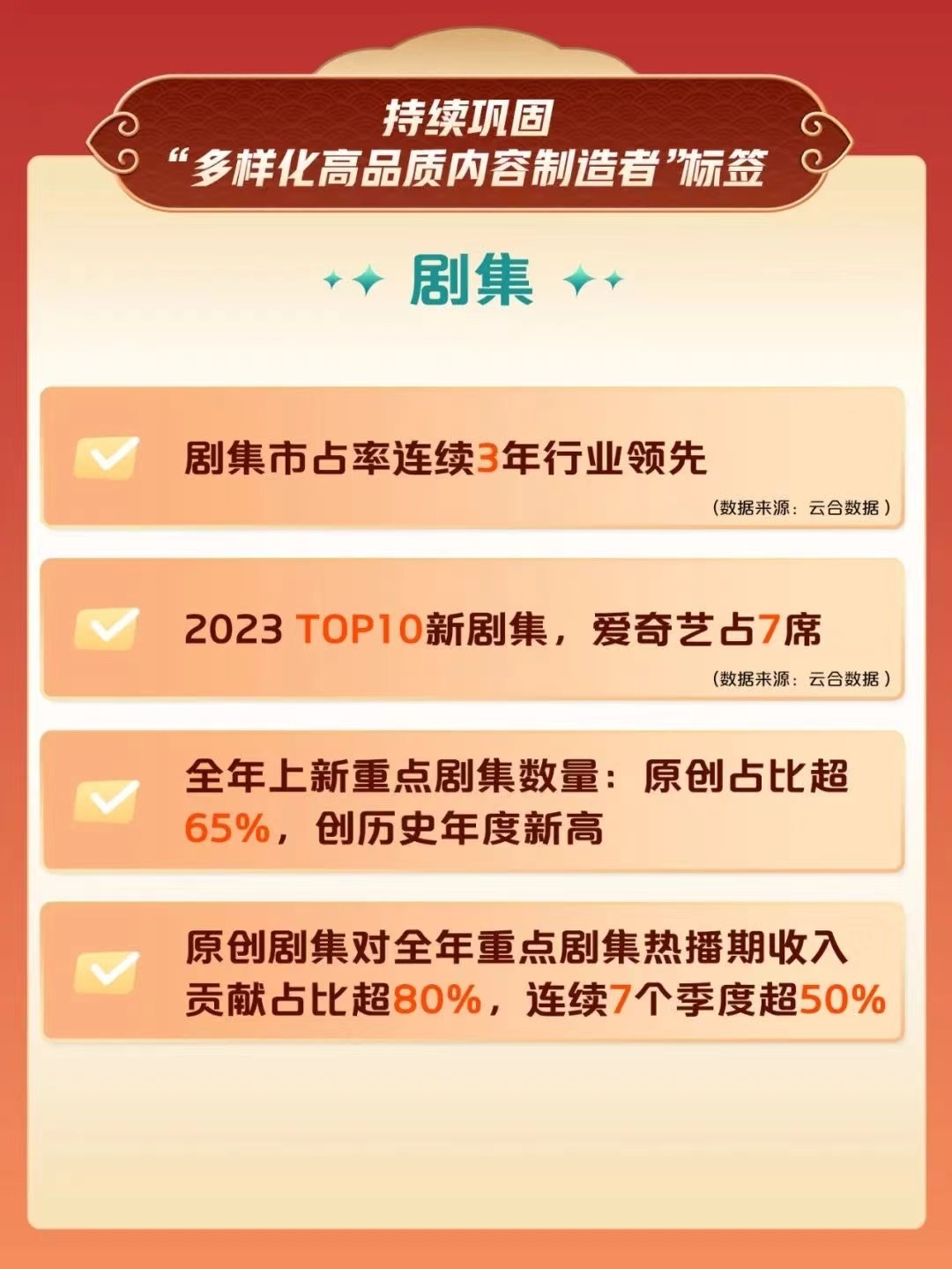数据显示,2023年爱奇艺全年上新重点剧集中,原创剧集数量占比超过65%,为公司史上年度新高。同时2023年爱奇艺剧集的内容成本率较2022年下降了12个百分点。