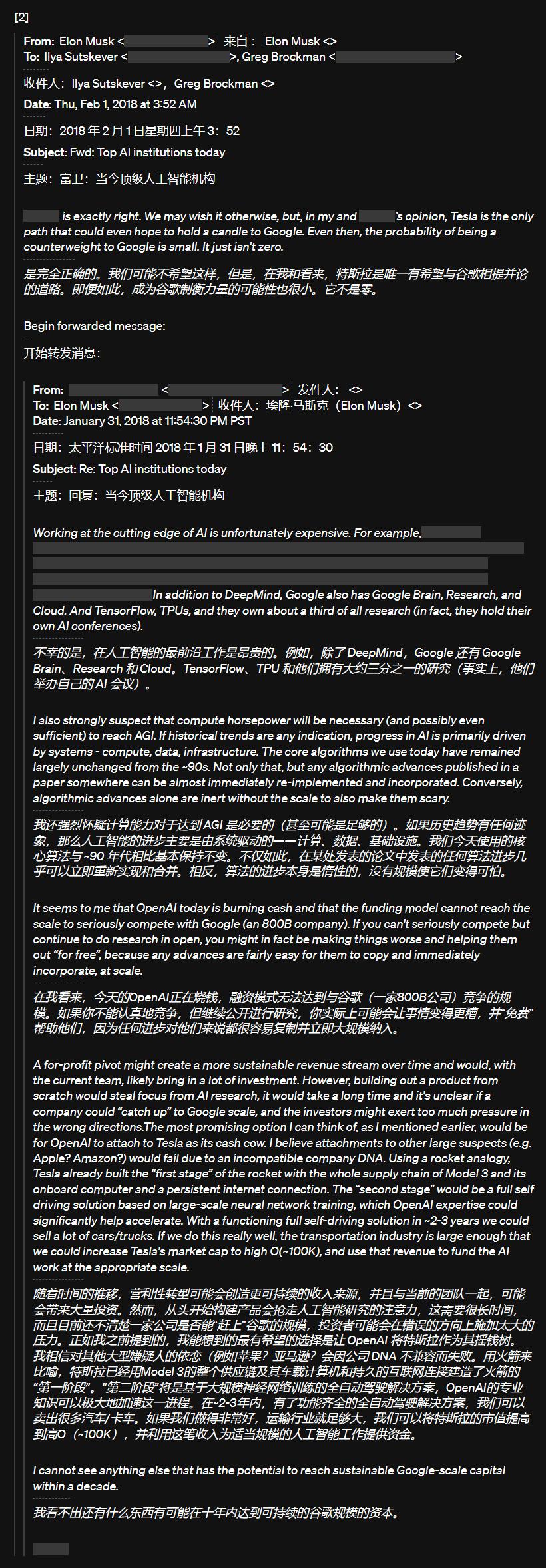 2018 年 2 月初,Elon 转发了一封电子邮件给我们,建议 OpenAI 应该「成为Tesla的资金来源」,他评论说这是「绝对正确的……在对抗 Google 方面,Tesla 是唯一有希望的路径。即便如此,成为 Google 对手的概率也很小,但并非零。」