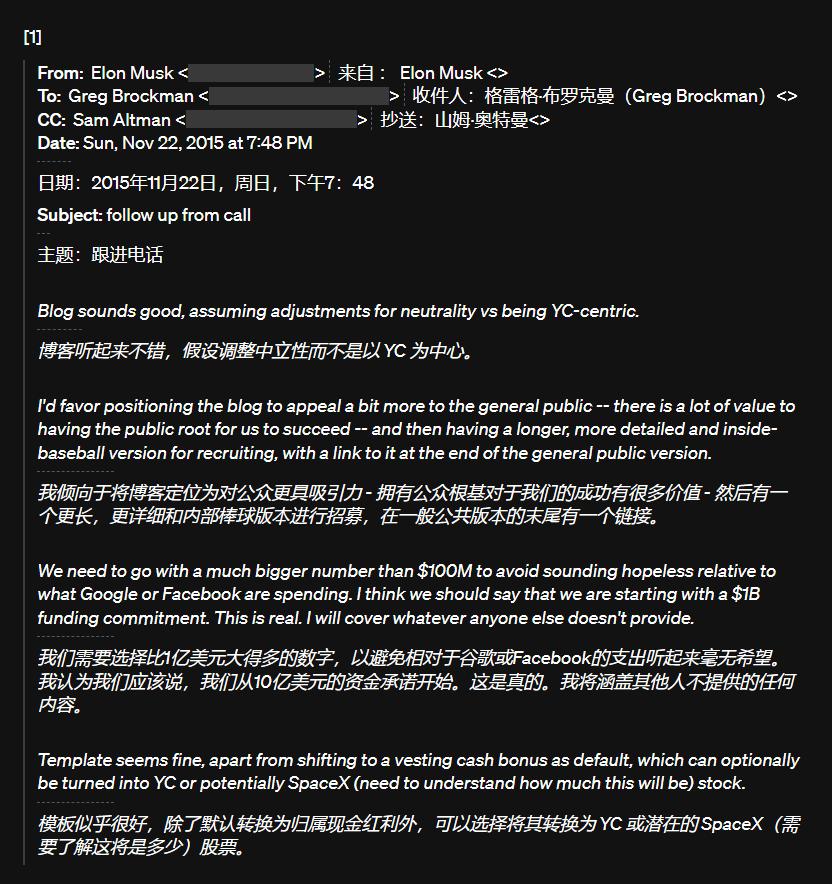 自 2015 年底启动 OpenAI 以来,Greg 和 Sam 本来打算筹集 1 亿美元。Elon 在一封邮件中建议:「我们需要提出一个远超 1 亿美元的数字,以免显得无望……我认为我们应该宣布,我们的起步资金承诺为 10 亿美元……我将补足其他人未能提供的部分。」