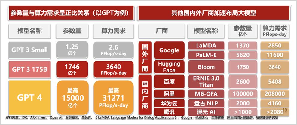 比如,ChatGPT-4参数量最高达到惊人的15000亿个,而参数量与算力呈正比关系,可推算GPT-4算力需求最高达到31271 PFlop/s-day。