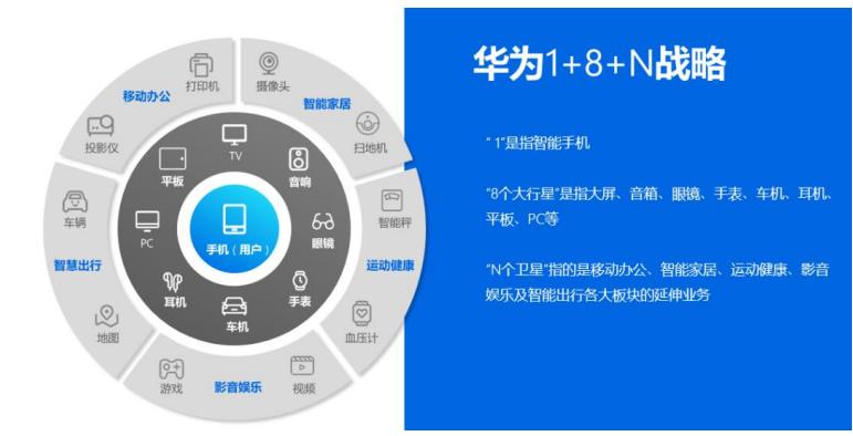 2019年,华为曾提出了“1+8+N”的全场景终端战略构想。在该构想中,华为希望通过手机作为智能终端的入口,连接平板、PC、汽车等智能硬件,并伴随延展移动办公、出行、运动健康等全场景的延伸业务。