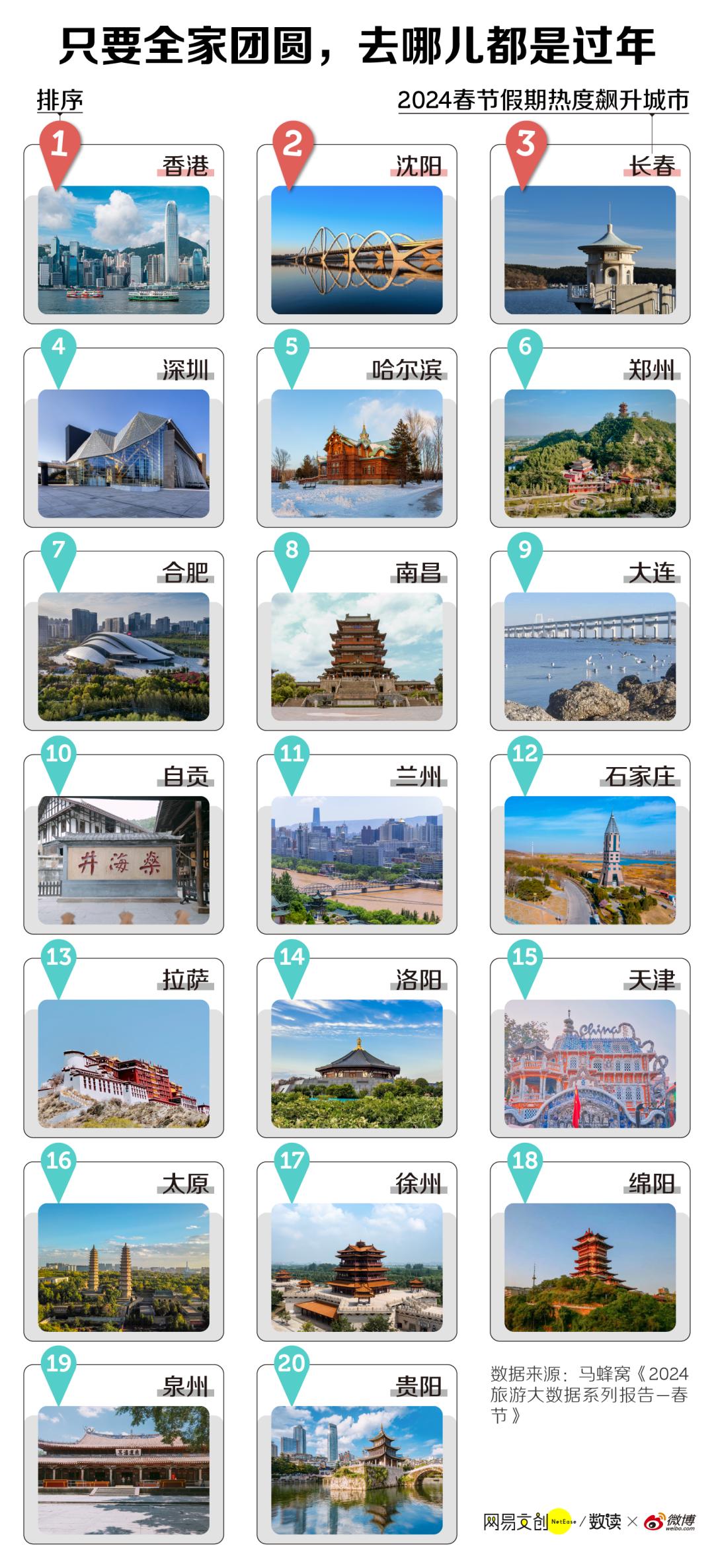 马蜂窝数据显示,香港、沈阳、长春、深圳、哈尔滨、郑州、合肥、南昌、大连和自贡成为春节假期旅游热度飙升城市 Top 10 [4]。