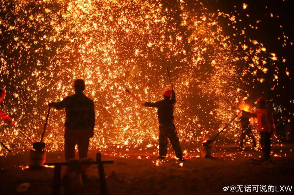 讨吉利的打铁花活动,因为“花”和“发”的谐音,有“打花打花,越打越发”之意。/ 新浪微博 @无话可说的LXW