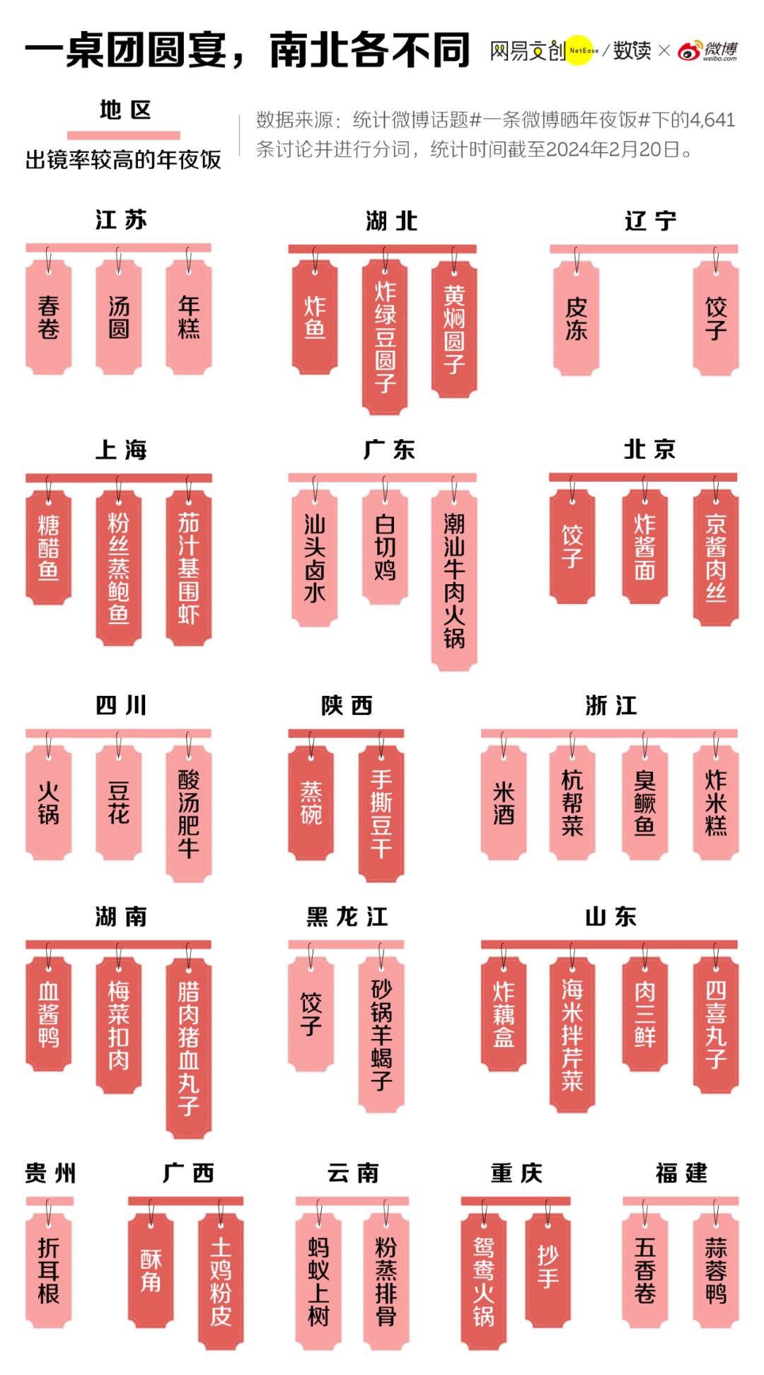 我们统计了微博话题 #一条微博晒年夜饭# 下的 4641 条讨论,发现北方确实对饺子爱得深沉,南方的主食则五花八门。