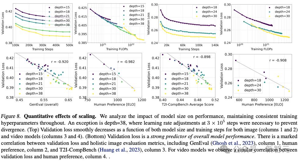 Stability AI训练了多个不同规模的模型,从 15 个模块、450M参数到38个模块、8B参数,发现模型大小和训练步骤都能平滑地降低验证损失。