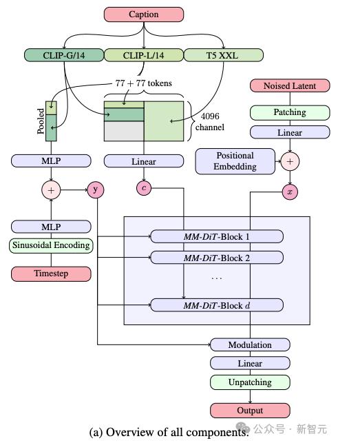 在文本到图像生成的过程中,模型需同时处理文本和图像这两种不同的信息类型。这就是作者将这种新技术称为MMDiT(多模态Diffusion Transformer的简称)的原因。