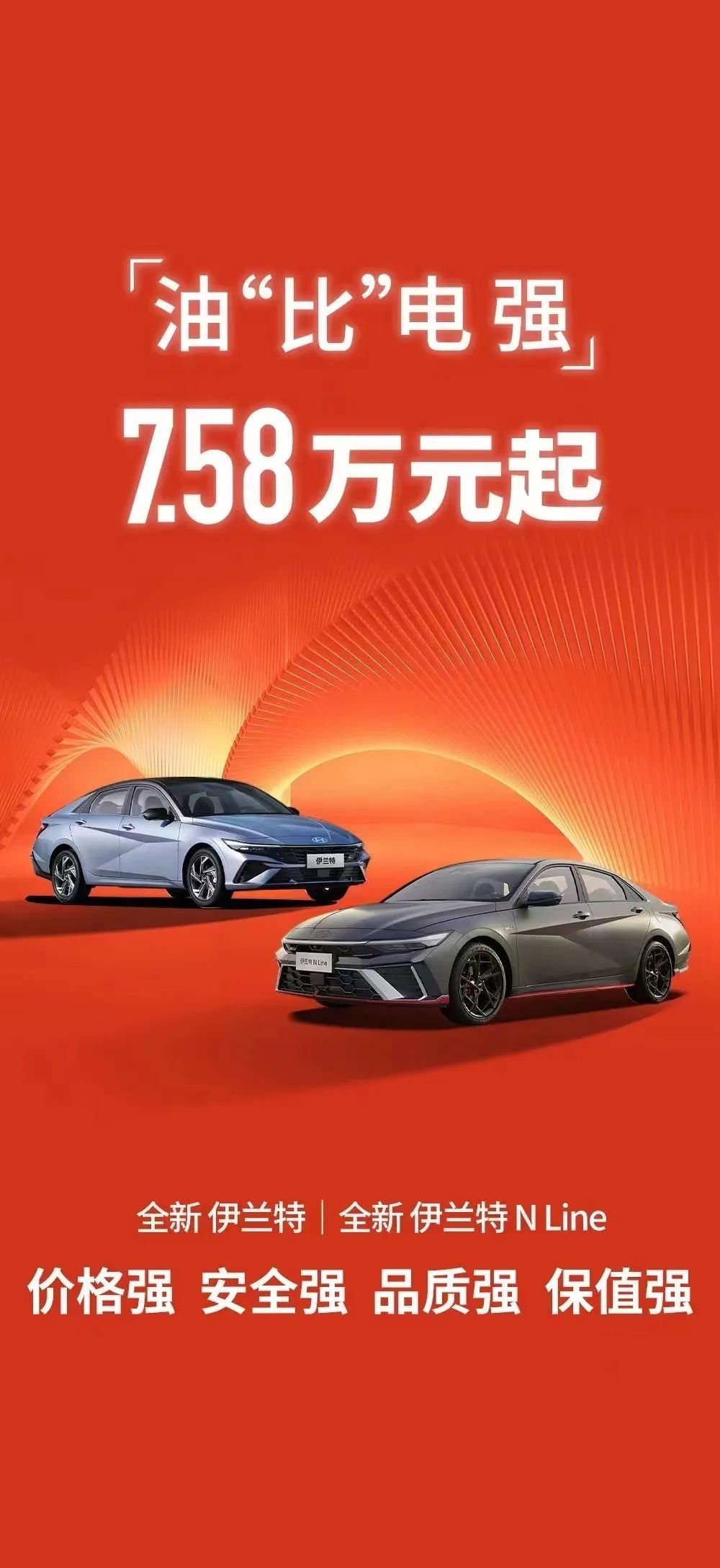 在比亚迪宣告降价后不久,北京现代就宣布伊兰特车型降价,最低不到7.6万元起,并针锋相对地喊出“油比电强”的口号;