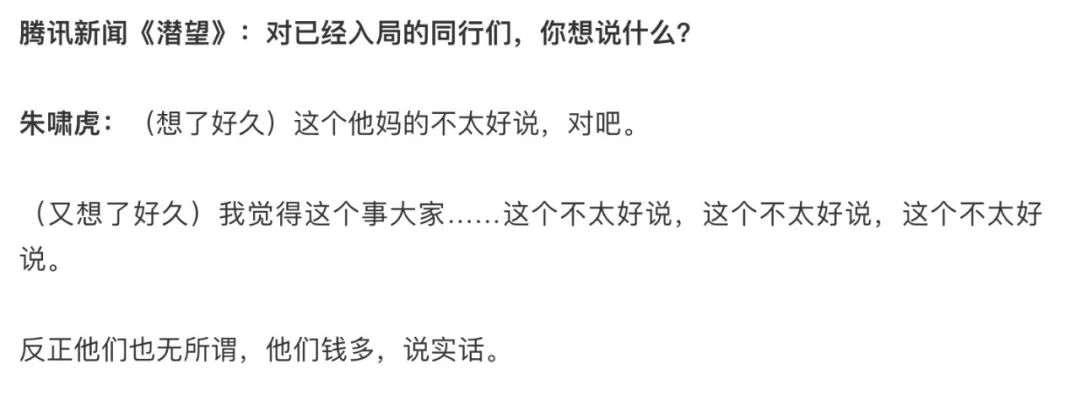 再比如下面这段让很多人“笑喷”的回答,那两个“想了好久”是神来之笔,朱总的四次“不太好说”也真实反应了,一名投资人,一名职人,在如何评价同行这个问题上,要不要回复,以及怎么回复的纠结心态。