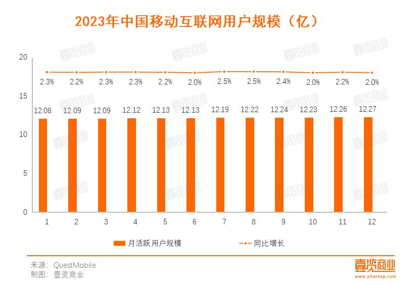 首先,互联网流量增长触顶。QuestMobile数据显示,移动互联网用户规模保持稳定发展,截至2023年12月,全网活跃用户总规模达到12.27亿,近一年增速在2.0%-2.5%区间。