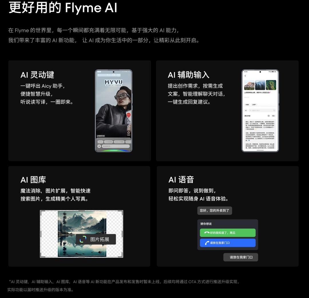 官方表示其已把AI融入到Flyme的每一个角落,例如AI灵动键、AI辅助输入、AI图库、AI语音等各种主流AI功能。但可惜的是,截止到3月6日,除了AI灵动键外其余几项功能仍未推送,也就是说这些所谓的AI功能都处于「画饼期」,起码现在小雷体验不到。