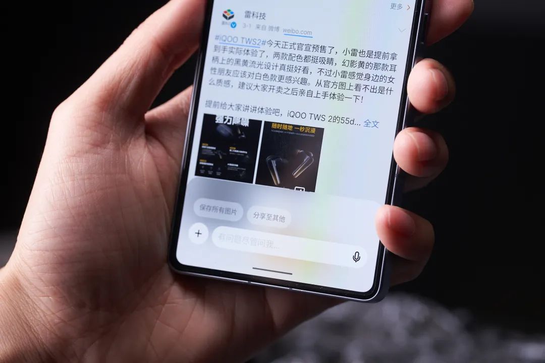 AI灵动键不是一个简单的“键”,而是唤起智能AI助理的新方式,其触发机制非常简单:短按屏幕下方的「mBack」键即可呼出Aicy识屏功能,它能够实时抓取到屏幕中的各种文字和图片信息,你可以通过它来复制屏幕中的文字和图片、将该页面以图片或是链接的方式发送给别人,当然面对外语也能进行翻译,相比起小米的传送门和OPPO的识屏(当前版本)确实好用一些。