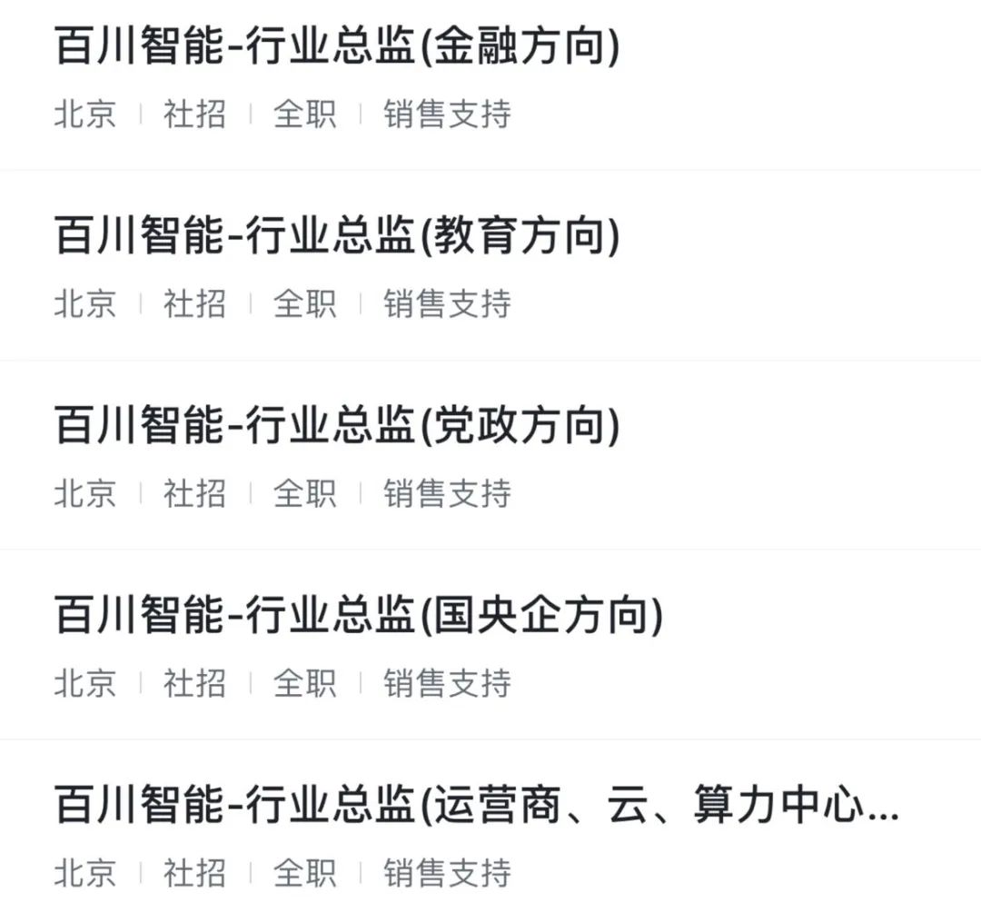此外,百川智能目前也在招聘很多商业化相关的岗位,包括商务经理、对应金融、教育、运营商等行业客户拓展的行业总监等。