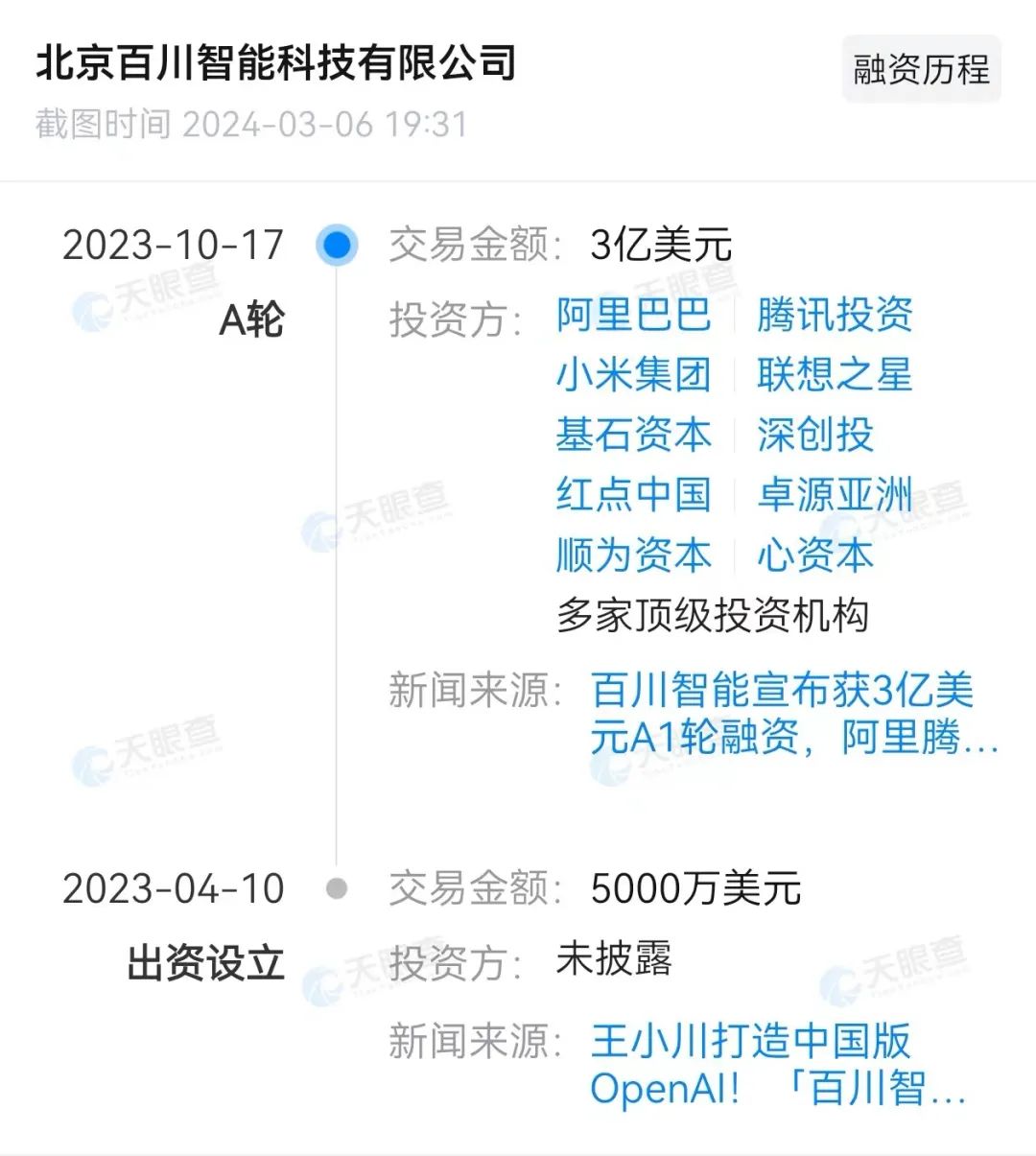 2023年10月17日,百川智能完成A轮融资,交易金额达到3亿美元,投资方为阿里巴巴、腾讯、小米、联想、基石资本、深创、红点中国、卓源亚洲、顺为资本、心资本等。