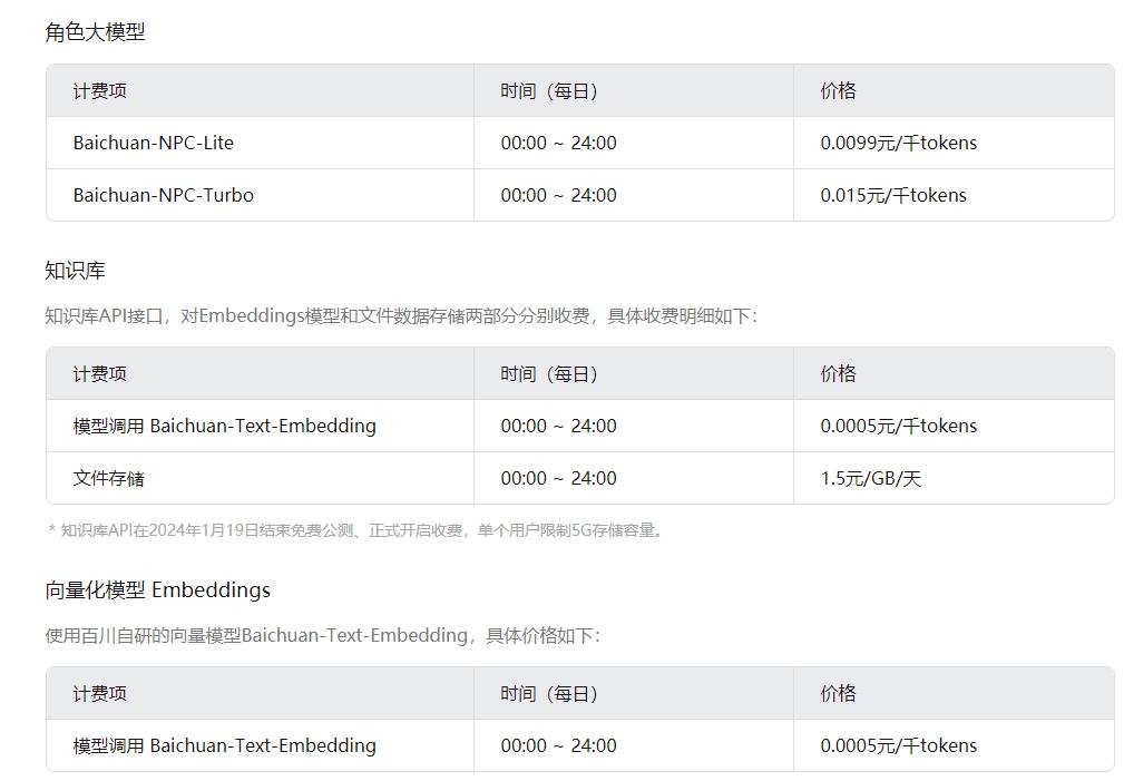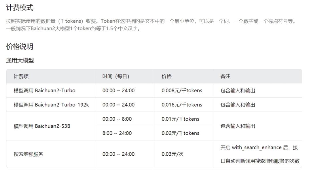 在百川智能官网上,能查看到百川大模型的收费标准,这也是目前百川商业化尝试的一种。