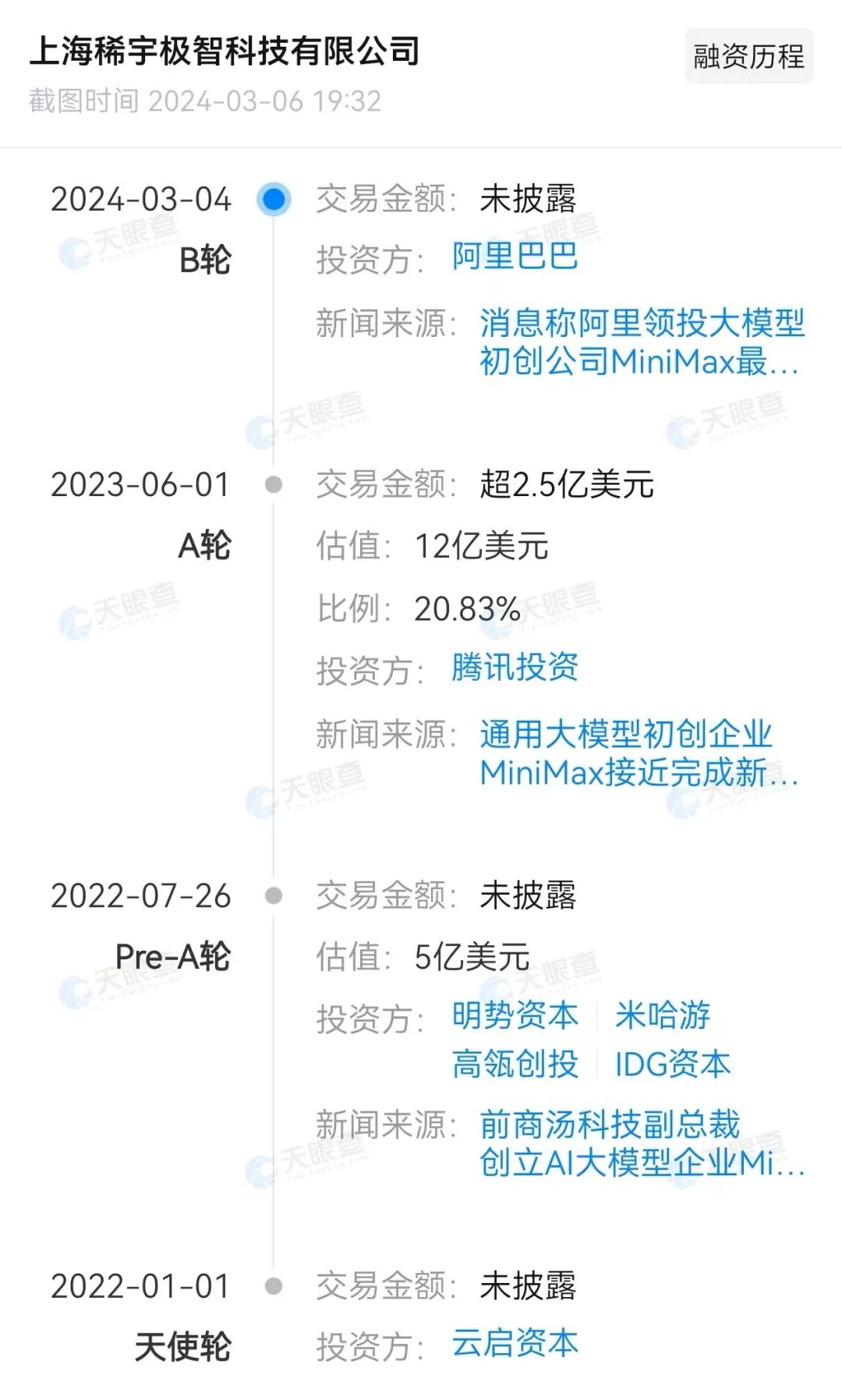 MiniMax于2022年1月1日完成天使轮融资;2022年7月26日完成Pre-A轮融资,估值5亿美元,投资方为明势资本、米哈游、高瓴以及IDG资本;2023年6月1日,MiniMax完成A轮融资,交易金额超过2.5亿美元,估值12亿美元,投资方为腾讯。