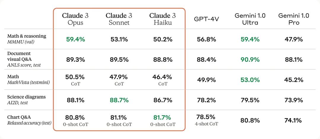 如图所示,Claude 3 在推理、数学、编码、多语言理解和视觉方面展现了卓越的性能。尽管在大型语言模型中,「知道」与「推理」之间的区别尚无共识,但人工智能研究界通常采用这些术语。Anthropic 声称,Opus 模型是三个模型中最为强大的,它在处理复杂任务时展现出了接近人类水平的理解力和流畅性。
