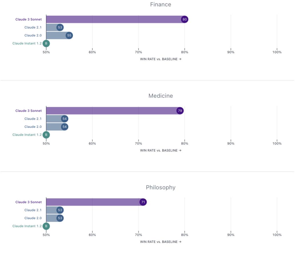 在 Anthropic 的技术报告中提到,团队增添了一项更具人性化的实践环节,邀请了金融、法律、医学和哲学等领域的专家与 Claude 3 进行一对一的问答对话,并在对话结束后由这些专家对模型的表现进行评分。结果显示,与之前的几代 Claude 模型相比,新模型在性能上取得了显著的进步。