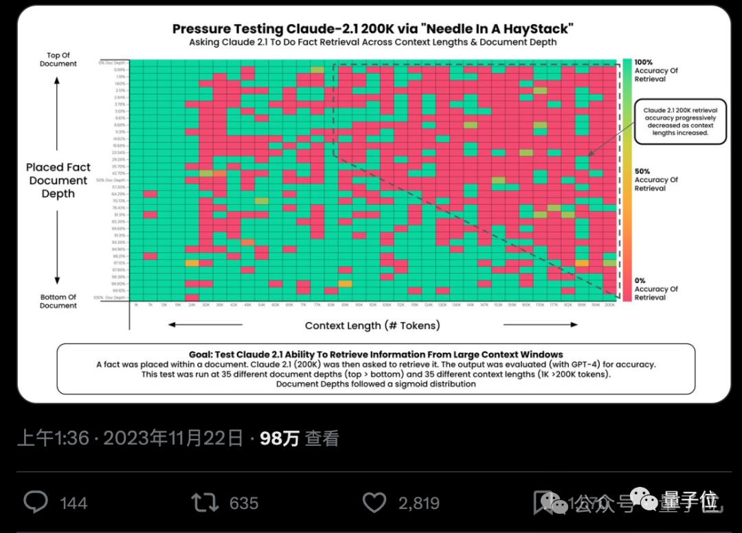 这次的测试方法叫“大海捞针”,量子位之前也介绍过,用来测试“大模型真的能从几十万字中准确找到关键事实吗?”。