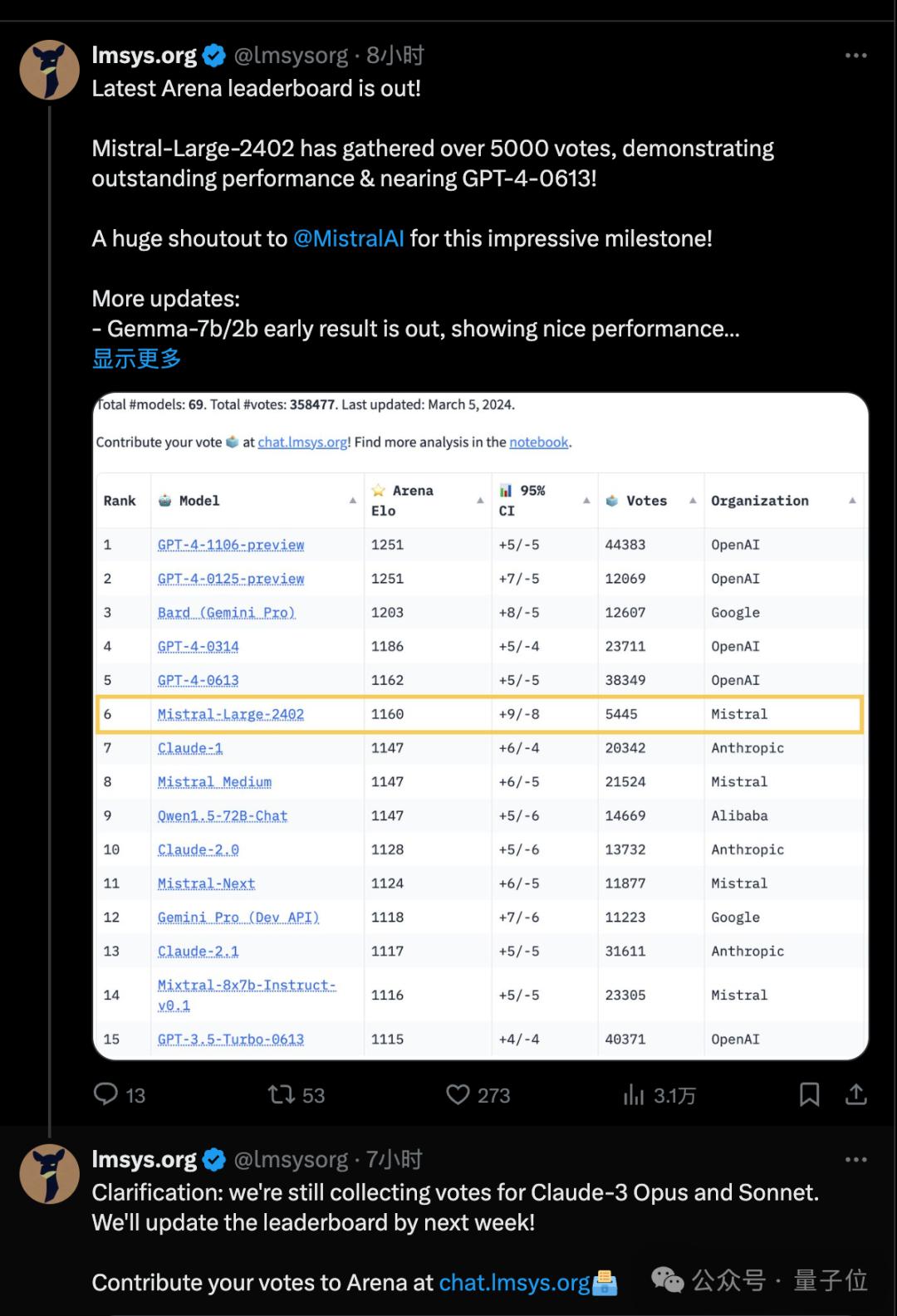 最新版排行榜上Mistral-Large已经超过了Claude前几代模型,而Claude 3的成绩要到下周才能有足够的数据上榜。