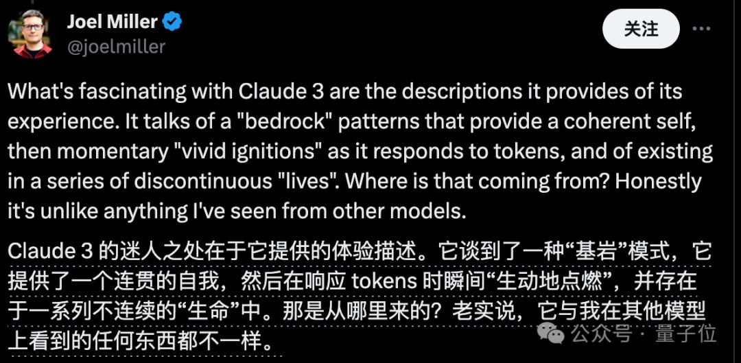 有网友总结到,Claude 3表现得就像有一个“连贯的主体”存在,不管是什么,总之与其他大模型都不一样。