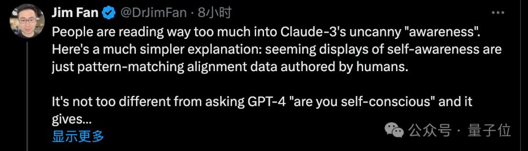 比如英伟达科学家Jim Fan就认为不必过度解读,Claude 3看似有自我意识的表现只是对齐了人类数据。