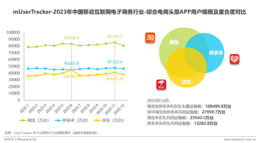 对比淘宝,京东而言,2023年拼多多APP全年流量波动幅度更小,核心用户群体较为稳定,而淘宝、京东APP流量随618、双十一大促增长较为明显,并在大促后呈现一定程度上的下滑态势。从APP用户重叠数量来看,淘宝、拼多多重合设备数量较大,为近2.8亿台。