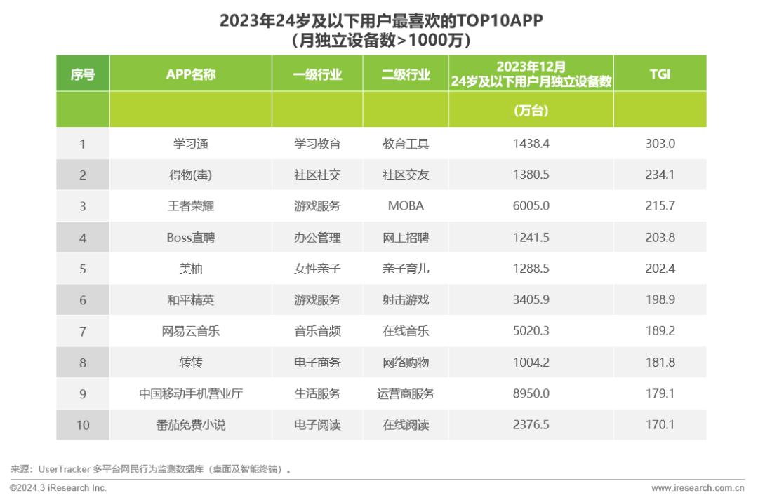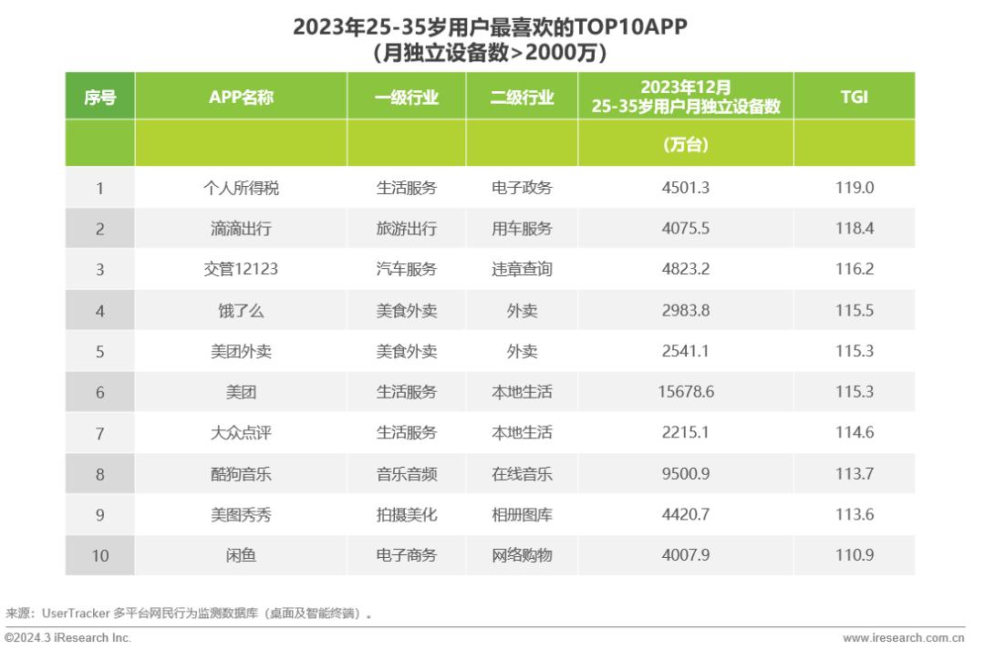 从用户偏好来看, 2023年12月24岁及以下用户最喜欢的APP前三名为:学习通、得物、王者荣耀;25-35岁用户最喜欢的APP前三名为:个人所得税、滴滴出行、交管12123。