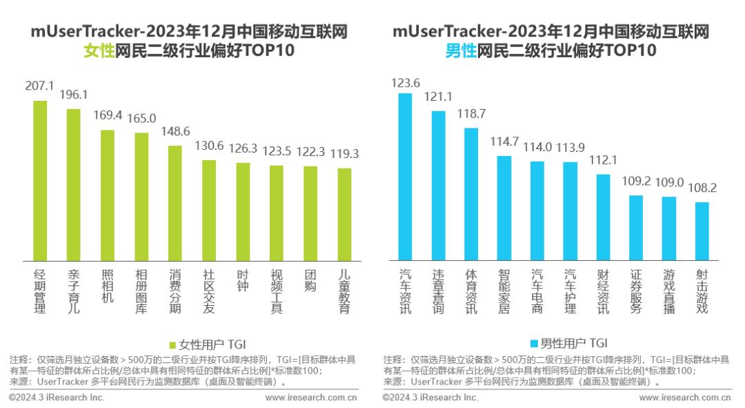 女性用户偏爱亲子类和拍摄美化类,男性用户对汽车服务类偏好更显著