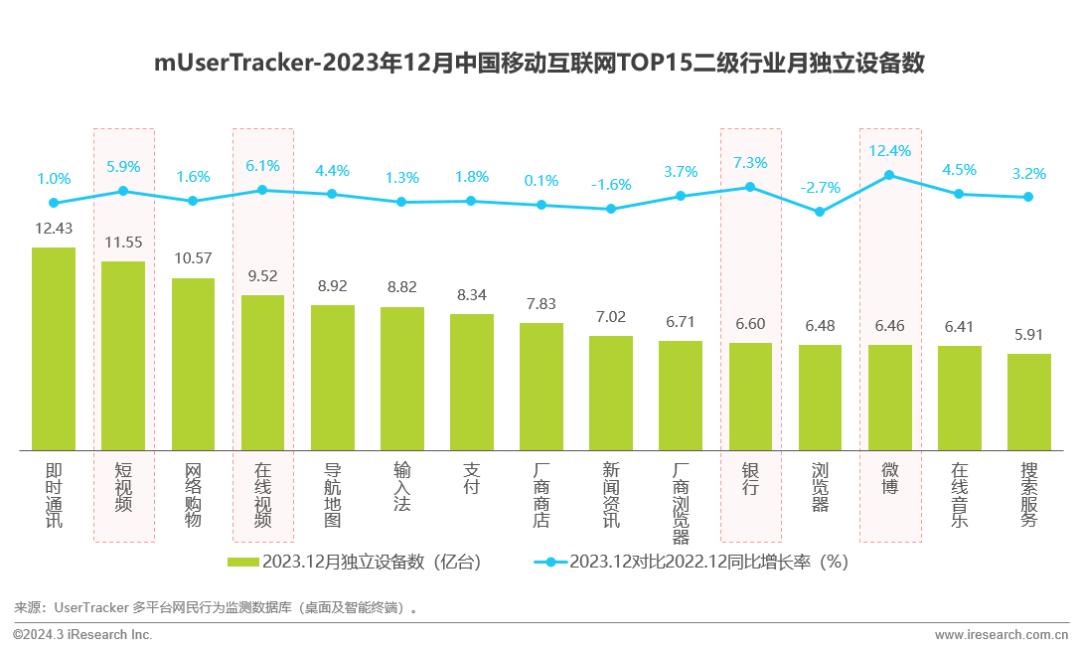 162个二级行业中,用户规模TOP15的二级行业2023年除新闻资讯、浏览器外流量均呈正增长,微博、银行、在线视频、短视频增幅领先
