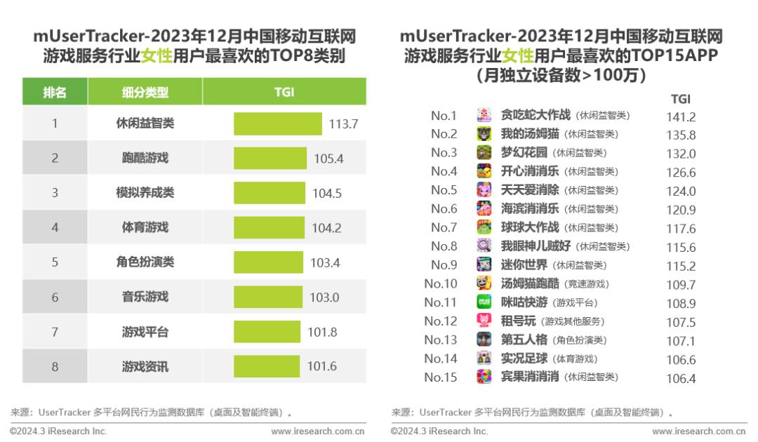 2023年12月游戏服务行业女性用户最喜欢的TOP15APP中,休闲益智类游戏如贪吃蛇大作战等占据第1~9位;此外,跑酷游戏、模拟养成类等也较受女性用户欢迎。