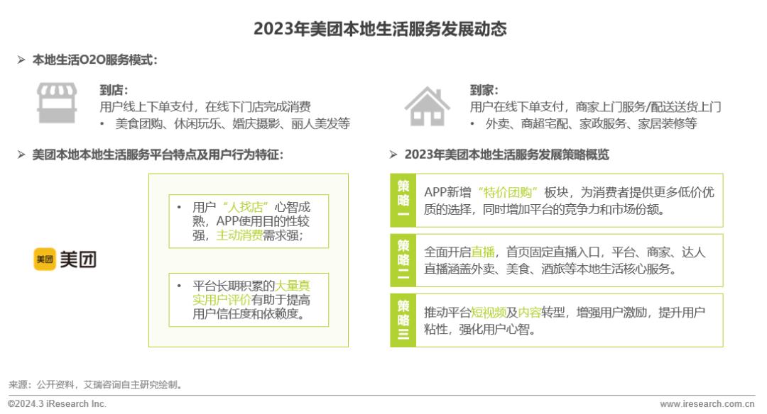 2023年,抖音持续发力本地生活业务,通过提升覆盖城市商家及品类数量、强化用户体验和内容质量、提升商家服务能力和准入门槛等策略驱动业务稳健扩张。面对来自抖音的挑战,美团及时响应,自3月起在APP中新增“特价团购”功能,为消费者带来更多实惠且高品质的选择,并于4月开启了首场外卖直播,聚合平台、商家等资源,进一步完善内容生态建设。二者在竞争中共同塑造了市场的多元化格局,推动本地生活服务行业向前发展。